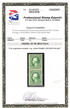 410, Mint XF NH 1¢ Line Pair With Graded 90 PSE Certificate - Stuart Katz