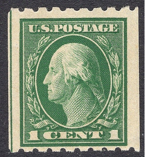 | #410 VF LH OG WIDE JUMBO 1¢ WASHINGTON PERF 8.50 SINGLE LINE WATERMARK COIL!! Scott #410 VF LH OG WIDE JUMBO Coil of 1c Washington coil issue on single line watermarked paper. Perf 8.5 horizontally. HUGE STAMP!!