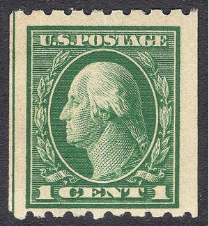 | #410 VF MNH OG WIDE JUMBO 1¢ WASHINGTON PERF 8.50 SINGLE LINE WATERMARK COIL!! Scott #410 VF MNH OG WIDE JUMBO Coil of 1c Washington coil issue on single line watermarked paper. Perf 8.5 horizontally. HUGE STAMP!!