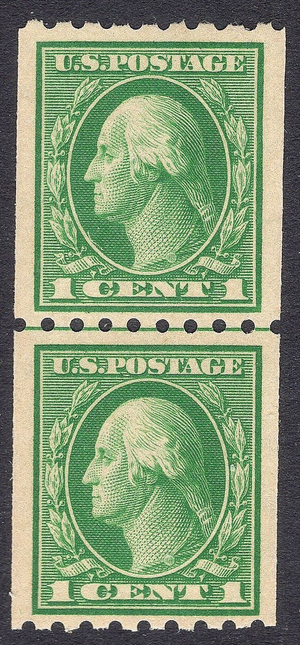 | #410 XF MNH OG JUMBO 1¢ WASHINGTON COIL LINE PAIR PERF 8.5 SINGLE LINE WATERMARK Scott #410 XF MNH OG WIDE JUMBO Coil line pair of 1c Washington on single line watermarked paper. Perf 8.5 horizontally. HUGE STAMP!!