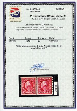413, Mint NH VF 2¢ Coil Line Pair With PSE Certificate* Stuart Katz