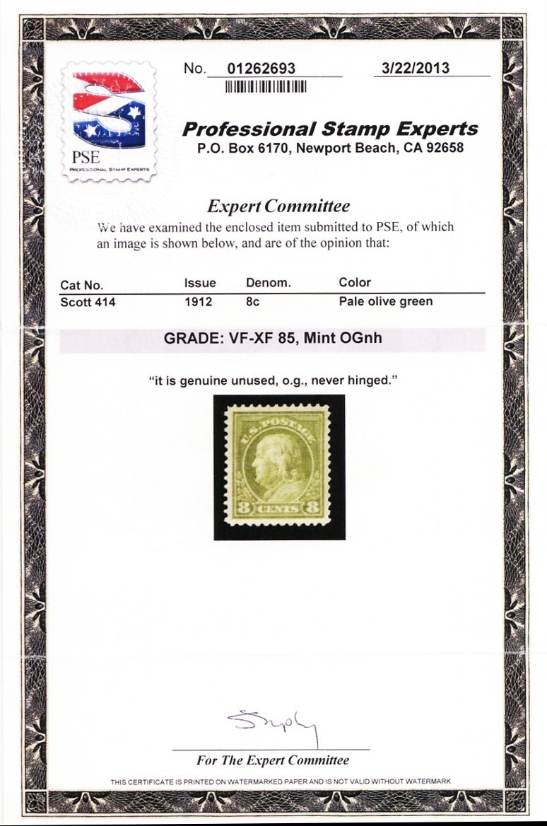 414, Mint VF/XF NH 8¢ With PSE Graded 85 Certificate * Stuart Katz