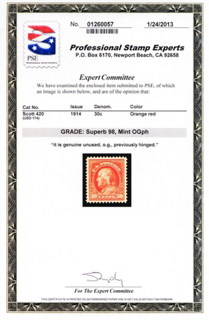 Due to the high cost of obtaining certificates we will only refund the cost of the stamp and not the cost of the certificate for stamps that sell for less than $250 that come back with a negative certificate. Stamps that sell for above $250 will receive a full refund for both the price of the stamp and cost of the certificate if it should come back not as described. For U.S. stamps only certificates from either APS, PSE or from the Philatelic Foundation are accepted, however "graded" certificates or "encased" items are not accepted.