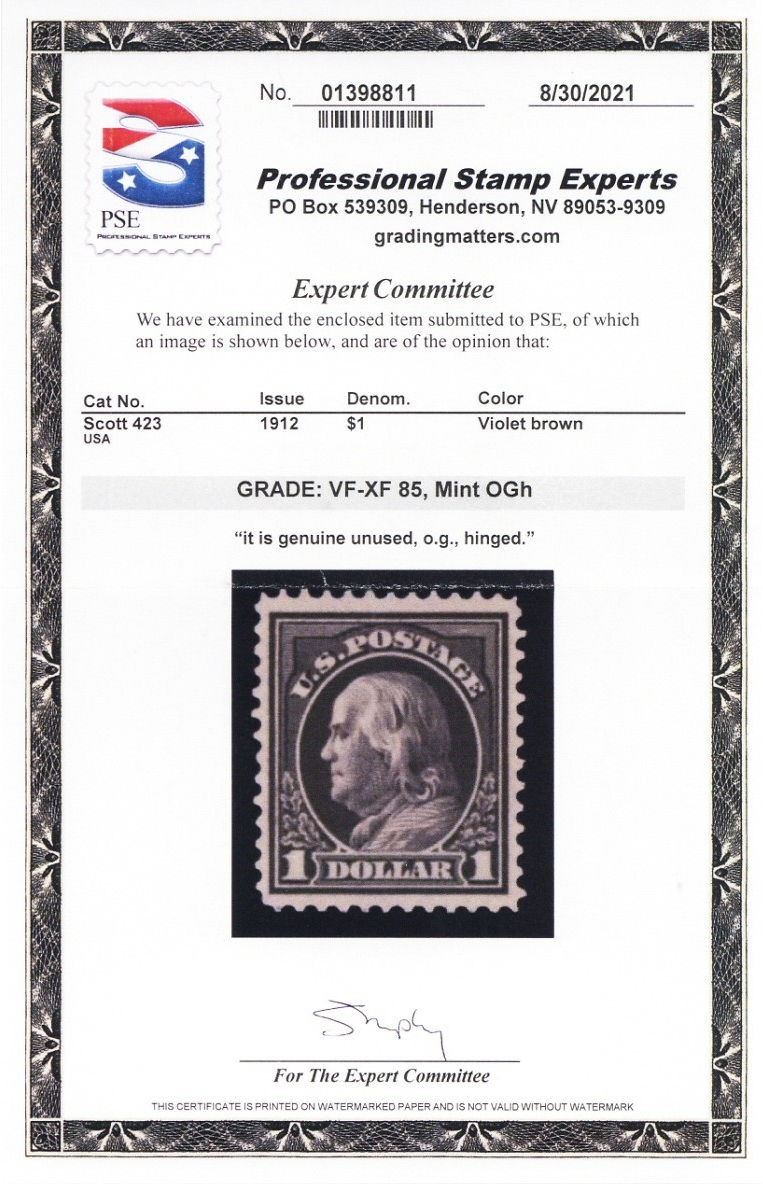 423, Mint VF/XF LH $1 With Graded 85 Certificate - Stuart Katz