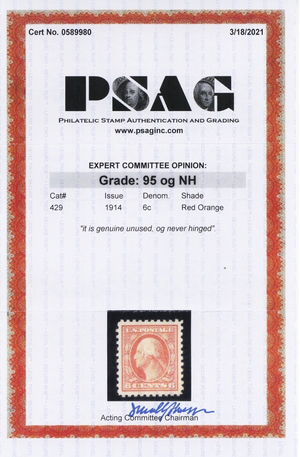 429, Mint NH XF/Superb 6¢ With PSAG Graded 95 Certificate SMQ $750 * Stuart Katz
