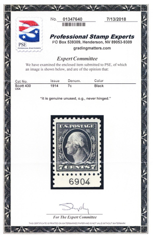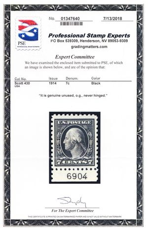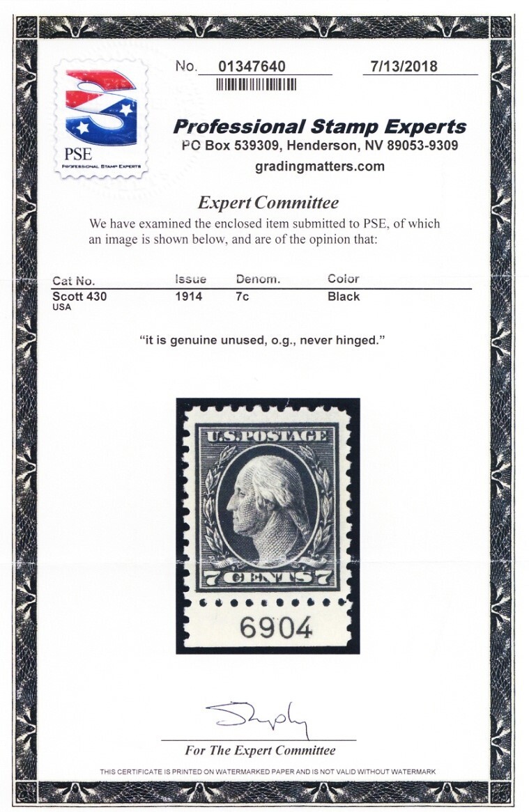 430, Mint VF/XF NH 7¢ With PL# With PSE Certificate - Stuart Katz