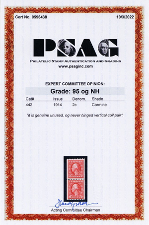 442, Mint NH 2¢ GEM - Coil Pair PSAG Graded 95 - Stuart Katz