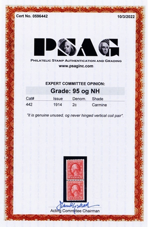 442 Mint NH XF/S 2¢ Coil Pair With PSAG Certificate Graded 95 - Stuart Katz