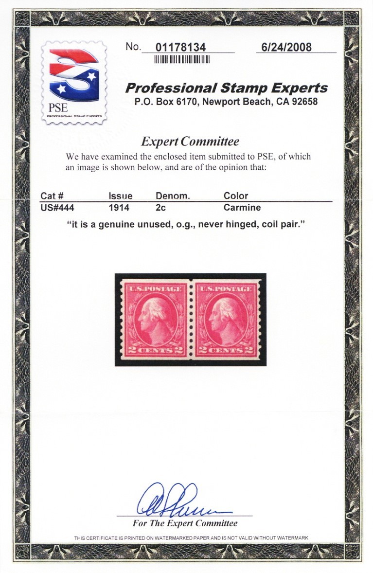 444, Mint VF NH 2¢ Coil Pair - PSE Certificate - Stuart Katz