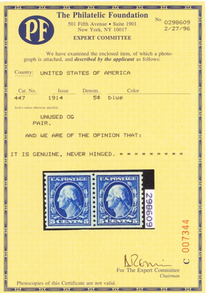 447, Mint NH VF/XF NH 5¢ Coil Pair With PFC Certificate - Stuart Katz