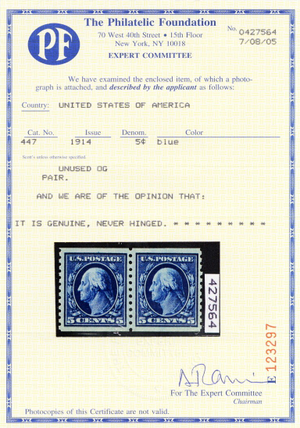 447, Mint VF NH 5¢ Coil Pair With PFC Certificate * Stuart Katz