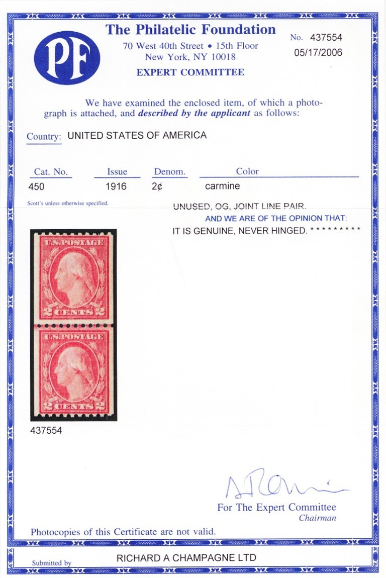450, Mint VF NH 2¢ Coil Line Pair With PFC Certificate ** Stuart Katz