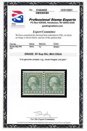 452, Mint XF/Sup NH 1¢ Coil Pair - With PSE Graded 95J JUMBO Cert - Stuart Katz