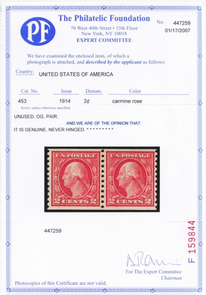 453, Mint VF NH 2¢ Coil Pair - With PFC Certificate - Stuart Katz