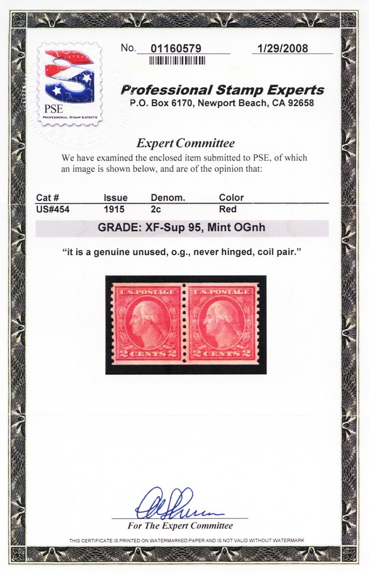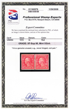 454, Mint NH XF/Superb 2¢ Coil Pair - PSE Graded 95 Cert - Stuart Katz