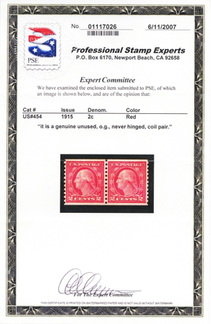 454, Mint VF NH 2¢ Coil Pair With PSE Certificate * Stuart Katz