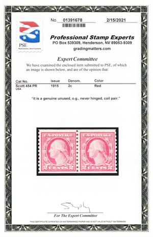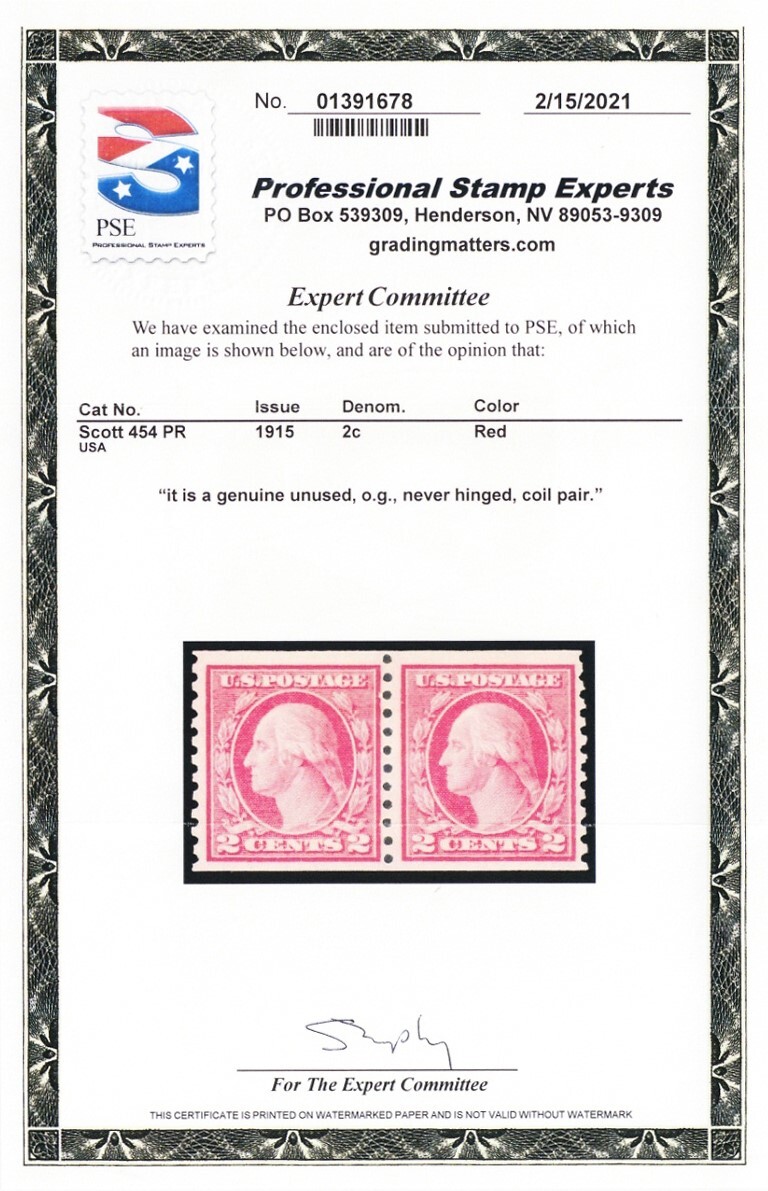 454, Mint VF NH 2¢ Coil Pair - With PSE Certificate - Stuart Katz