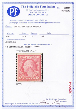 Due to the high cost of obtaining certificates we will only refund the cost of the stamp and not the cost of the certificate for stamps that sell for less than $250 that come back with a negative certificate. Stamps that sell for above $250 will receive a full refund for both the price of the stamp and cost of the certificate if it should come back not as described. For U.S. stamps only certificates from either APS, PSE or from the Philatelic Foundation are accepted, however "graded" certificates or "encased" items are not accepted.