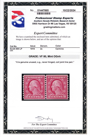 455, MNH VF 2¢ Coil Line Pair - PSE Graded 80 Certificate * Stuart Katz
