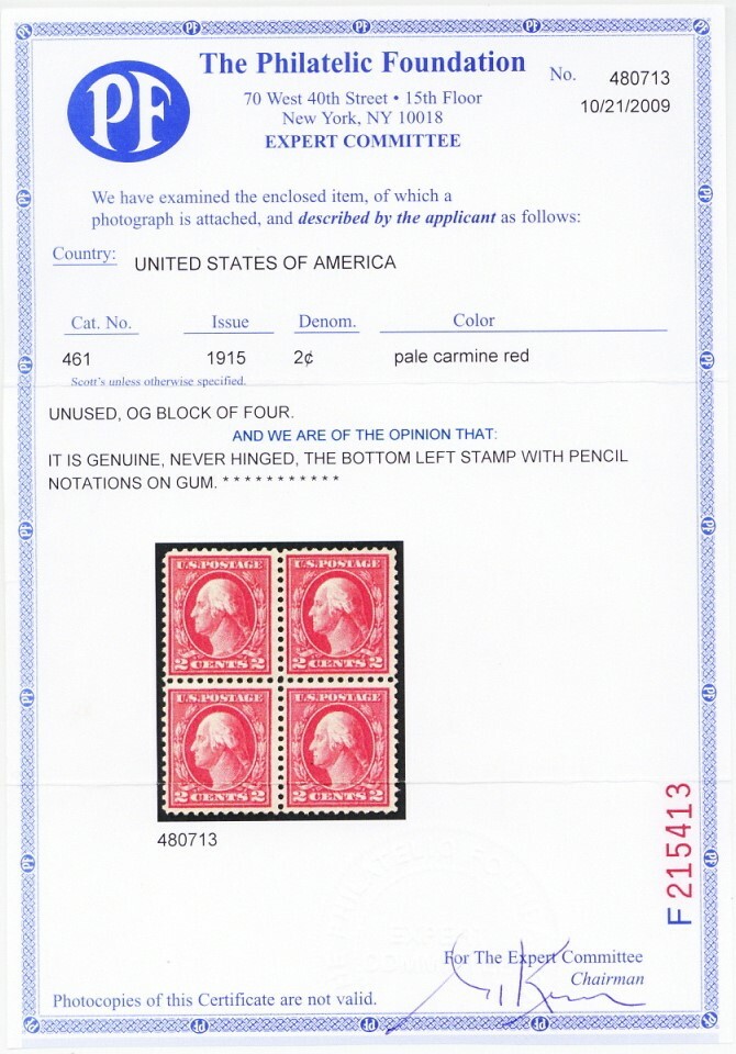 461, Mint VF NH RARE 2¢ Block of Four With PFC Certificate CV $1300 Stuart Katz