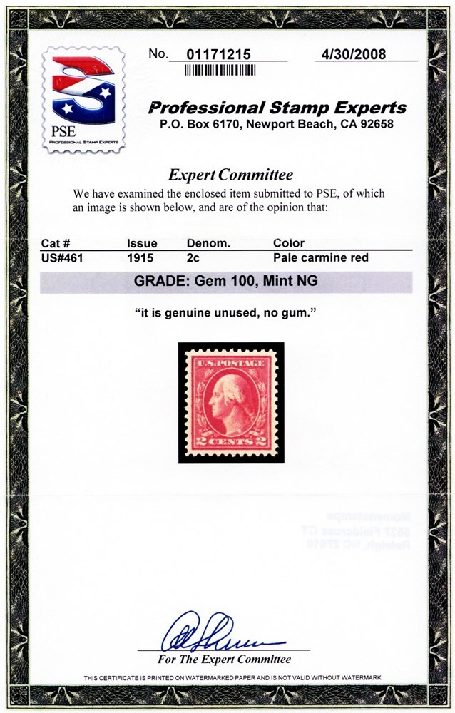 Due to the high cost of obtaining certificates we will only refund the cost of the stamp and not the cost of the certificate for stamps that sell for less than $250 that come back with a negative certificate. Stamps that sell for above $250 will receive a full refund for both the price of the stamp and cost of the certificate if it should come back not as described. For U.S. stamps only certificates from either APS, PSE or from the Philatelic Foundation are accepted, however "graded" certificates or "encased" items are not accepted.