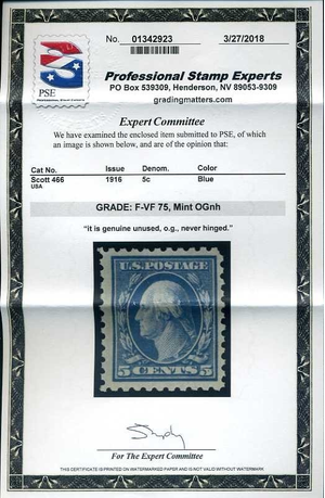 466, 5¢ Washington, PSE graded F-VF 75 NH certificate, SMQ $105