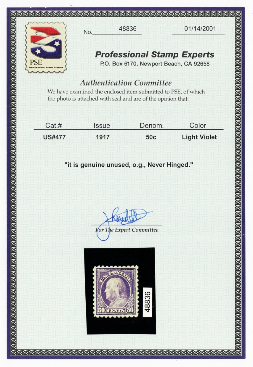 477, Mint VF NH 50¢ Franklin - With Clean PSE Certificate * Stuart Katz