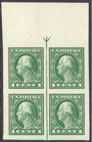 Superb MNH GEM top Arrow Block of 4 of Scott #481 1-cent Washington Flat plate printing on unwatermarked paper issue. Very fresh color and extremely well centered Plate block. Gum is perfect. HUGE Margins all around. Get this Gem into your collection now!!