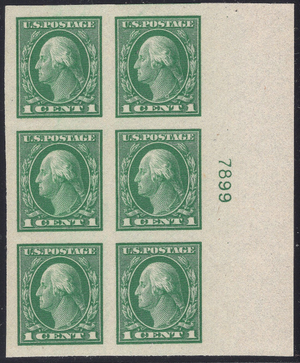 XF Hinged OG Right Side Plate Block of 6 of Scott #481 1-cent Washington Flat plate printing on unwatermarked paper issue. Very fresh color and extremely well centered Plate block. Gum is great with hinge marks on top right stamp and bottom left stamp. Big Margins all around.