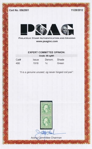 486, Mint NH Superb 1¢ Coil Pair - PSAG Graded 98 Certificate * Stuart Katz