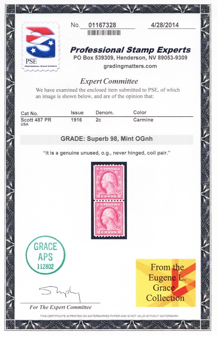 487, Mint NH Superb 2¢ Coil Pair - PSE Certificate Graded 98 * Stuart Katz