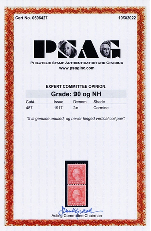 487, Mint NH XF 2¢ Coil Pair With PSAG Certificate Graded 90 -- Stuart Katz