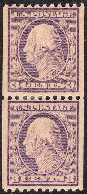 | #489 VF Hinged OG 3c WASHINGTON TYPE I COIL PAIR!! Scott #489 VF Hinged OG coil pair of Washington coil issue Type I variety on unwatermarked paper.