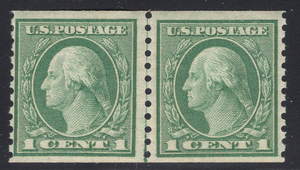 Scott #490 XF MNH OG LINE pair of the 1 cent Washington coil perfed vertically. Very fresh with great gum.