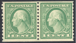 Scott #490 XF MNH OG pair of the 1 cent Washington coil perfed vertically. Very fresh with great gum.