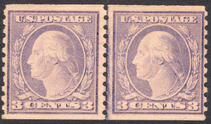 Scott #493 F-VF MNH OG line pair of type I variety of the 3 cent Washington coil perfed vertically. Lightly hinged pair. Fresh.