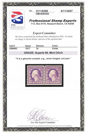 493, Mint Superb NH 3¢ Coil Pair With Graded 98 PSE * Stuart Katz