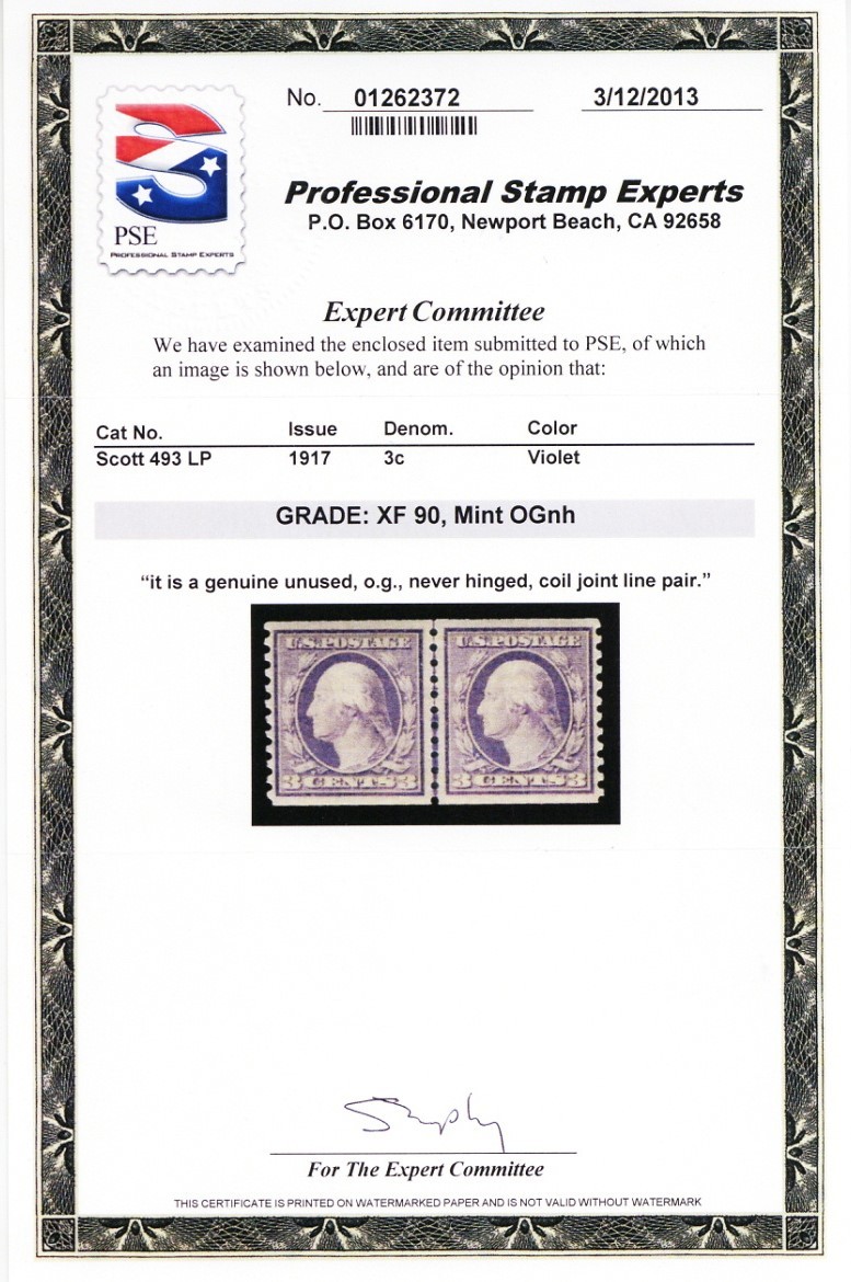 493, Mint XF NH 3¢ Coil Line Pair - With PSE Graded 90 Certificate * Stuart Katz