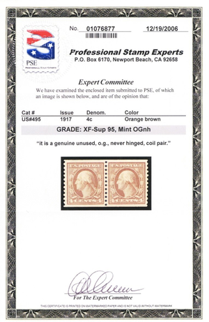 495, Mint NH XF/Superb 4¢ Coil Pair - PSE Graded 95 Certificate * Stuart Katz