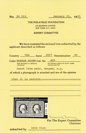 Due to the high cost of obtaining certificates we will only refund the cost of the stamp and not the cost of the certificate for stamps that sell for less than $250 that come back with a negative certificate. Stamps that sell for above $250 will receive a full refund for both the price of the stamp and cost of the certificate if it should come back not as described. For U.S. stamps only certificates from either APS, PSE or from the Philatelic Foundation are accepted, however "graded" certificates or "encased" items are not accepted.