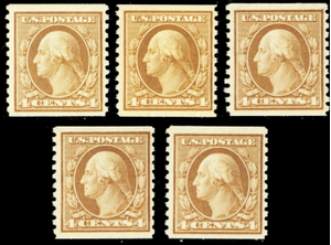 495, Mint VF NH 4¢ Coils Group of Five Stamps Cat $64.50 - Stuart Katz