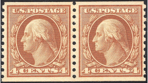 XF MNH OG pair of Scott #495 4-cent Washington Horizontal coil issue perfed vertically. Very fresh color, perfect gum and excellent centering for this issue. Get this one into your collection now.