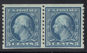 F-VF MNH OG Scott #496 5-cent Washington Horizontal PAIR coil issue perfed vertically. Get this one into your collection now.