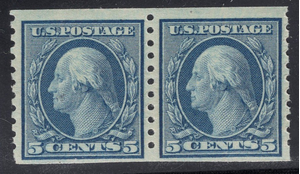 F-VF MNH OG Scott #496 5-cent Washington Horizontal PAIR coil issue perfed vertically. Get this one into your collection now.