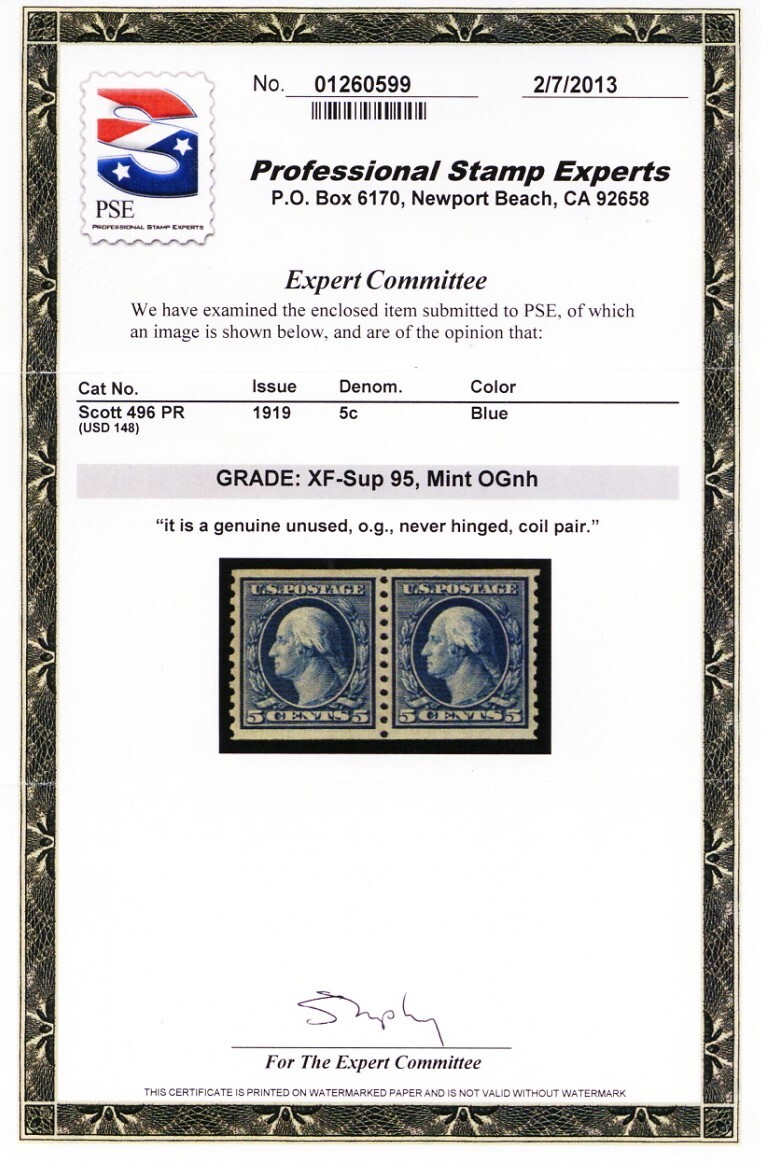 496, Mint XF/Superb NH 5¢ Coil Pair - PSE Graded 95 Certificate * Stuart Katz