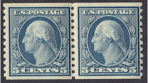 VF MNH OG pair of Scott #496 5-cent Washington Horizontal coil issue perfed vertically. Very fresh color, perfect gum and excellent centering for this issue. Get this one into your collection now.