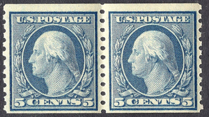 VF MNH OG pair of Scott #496 5-cent Washington Horizontal coil issue perfed vertically. Very fresh color, perfect gum and excellent centering for this issue. Get this one into your collection now.