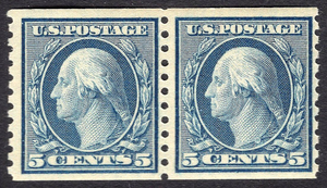 VF MNH OG pair of Scott #496 5-cent Washington Horizontal coil issue perfed vertically. Very fresh color, perfect gum and excellent centering for this issue. Get this one into your collection now.