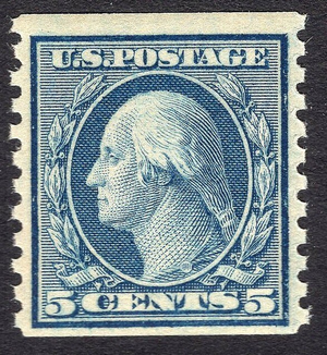 VF MNH OG Scott #496 5-cent Washington Horizontal coil issue perfed vertically. Very fresh color, perfect gum and excellent centering for this issue. Get this one into your collection now.