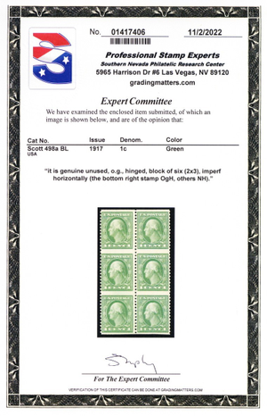 498a, Mint VF Imperforate Between Block of 6 PSE Cert CV $2,400+ - Stuart Katz